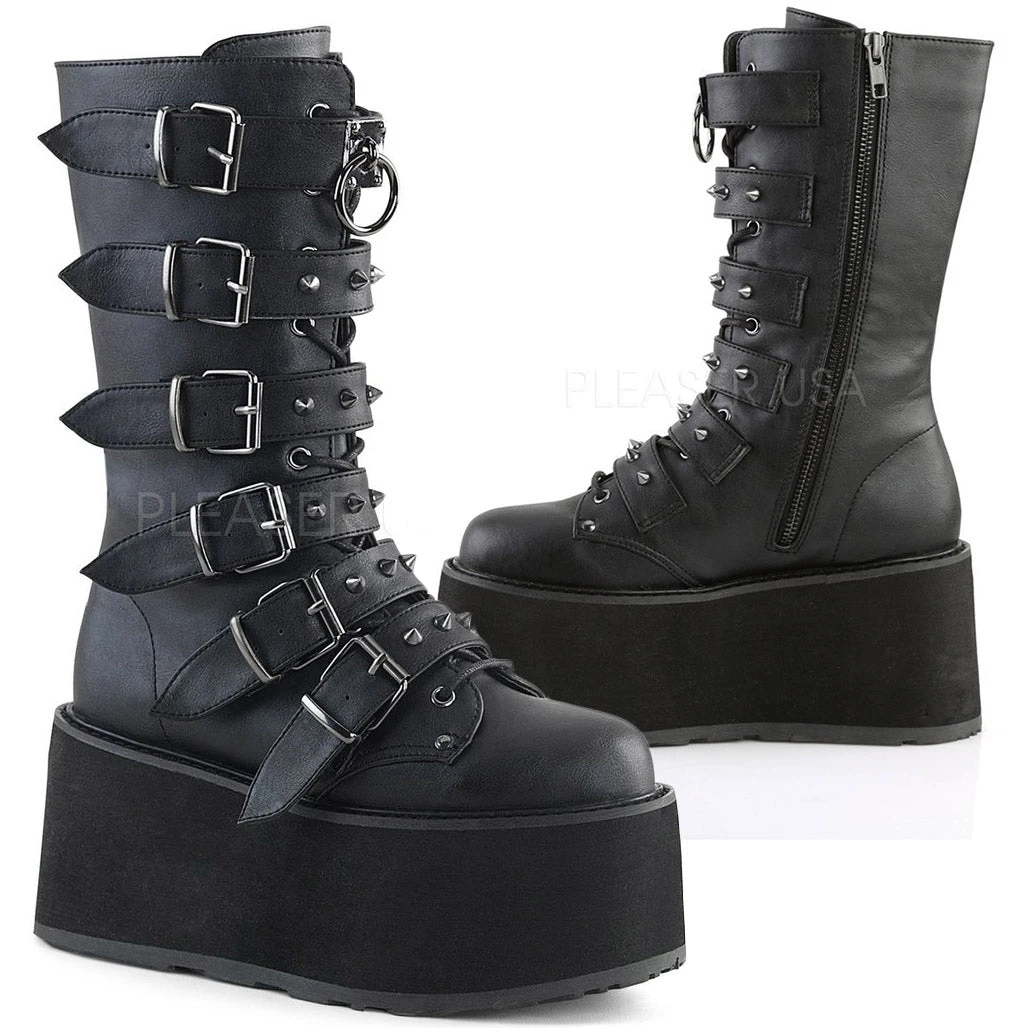 3 1/2″ (90mm) Platform Lace-Up Front Mid-Calf Boot Featuring 6 Cone-Studded Buckle Straps, Inside Metal Zip Closure.