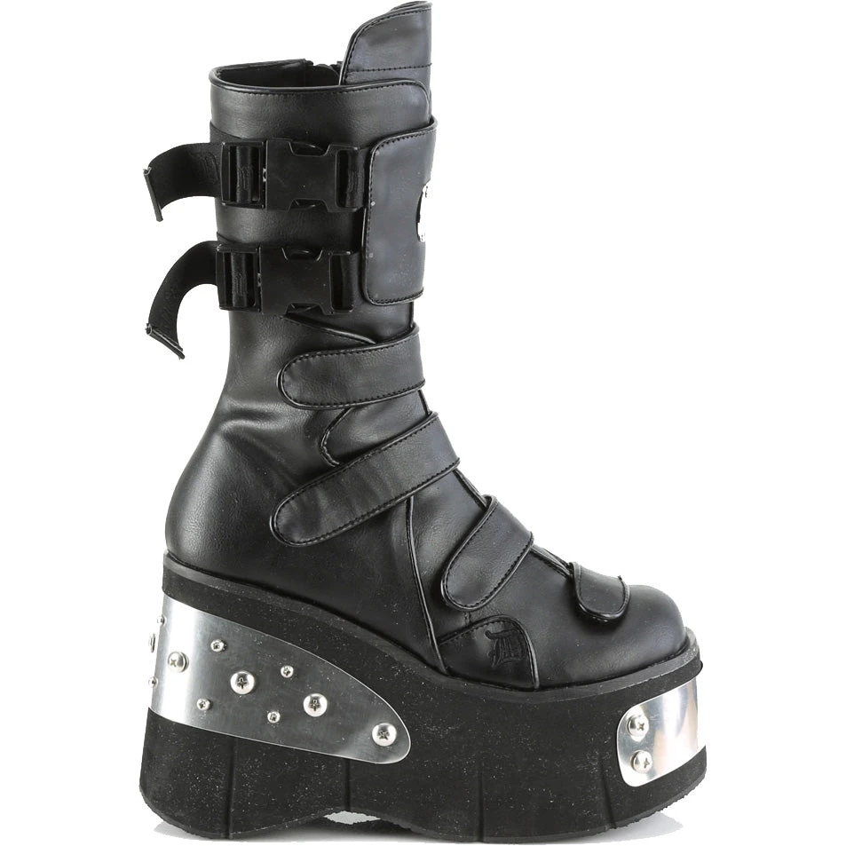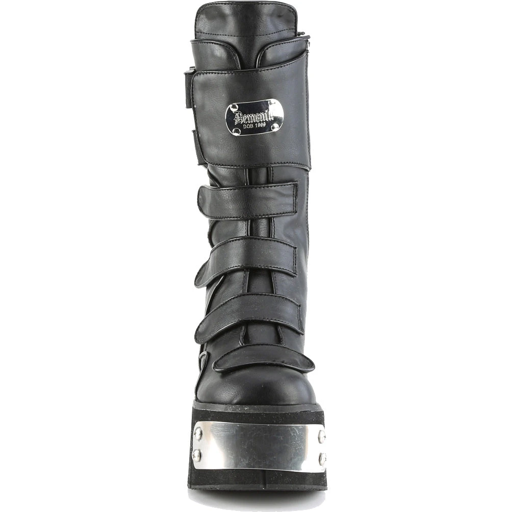 4 1/2″ (114mm) Front and Back Metal Plated Platform Strappy Mid-Calf Boot Featuring Front Shield with Branded Metal Plate Center Detail and Dual Snap Buckles and Hook and Loop Straps on the Remaining Straps, Full Length Inside Metal Zip Closure.