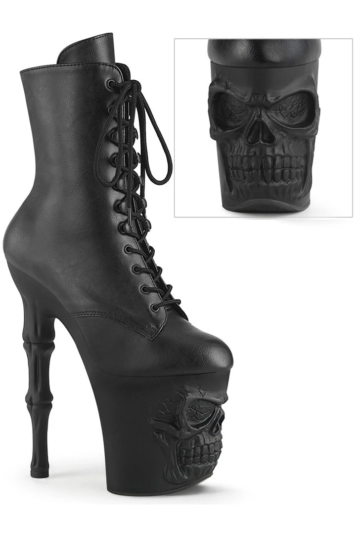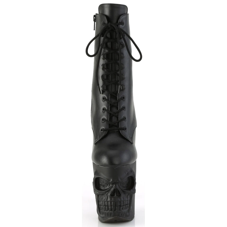 8″ (200mm) Finger Bone Heel, 4″ (100mm) Skull Sculpted Platform Lace-Up Front Ankle Boot, Inside Zip Closure.