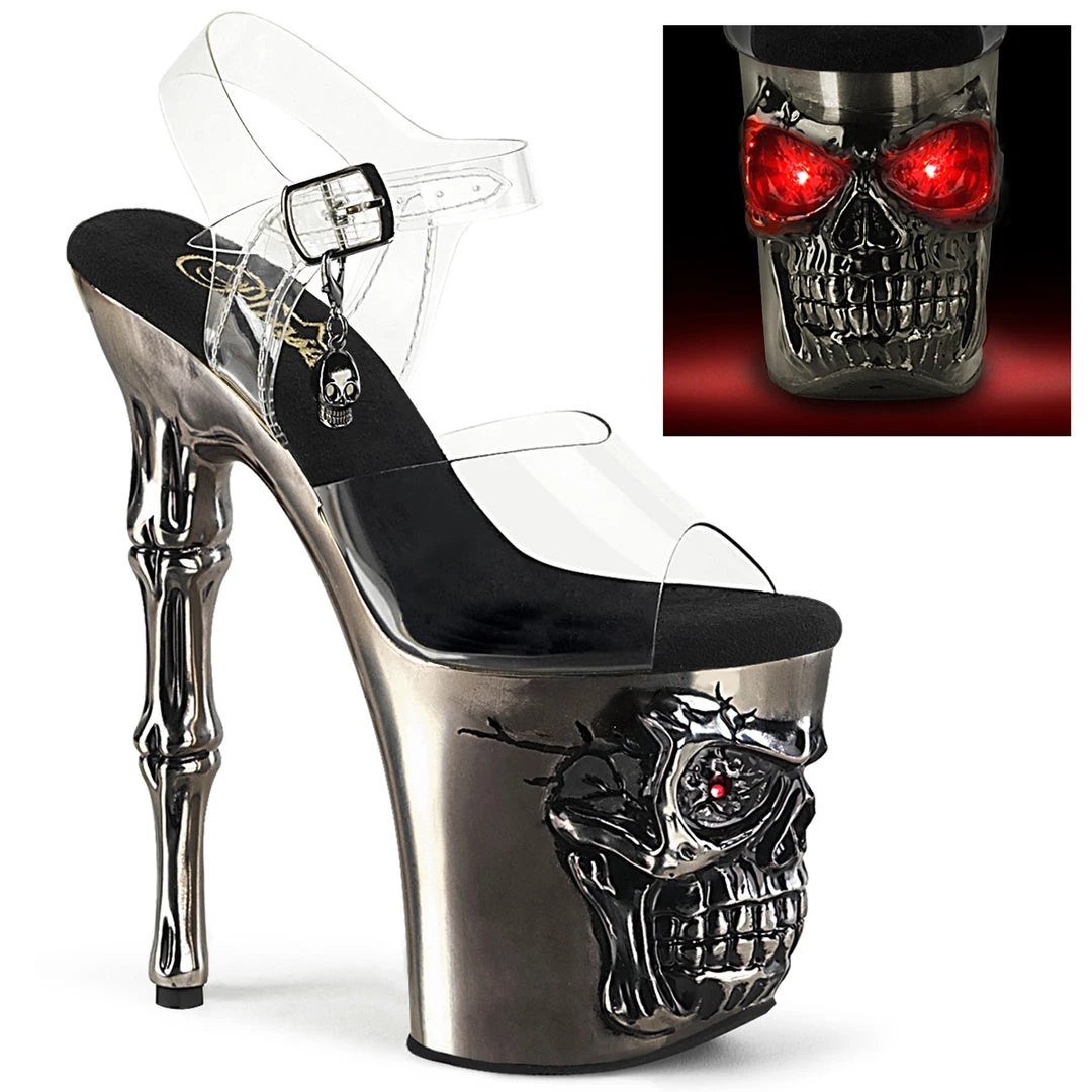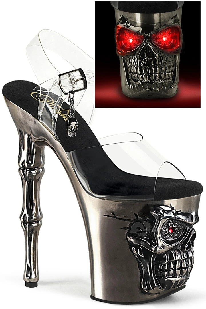 8″ (200mm) Finger Bone Heel, 4″ (100mm) Skull Sculpted Platform Ankle Strap Sandal with Mini Skull Charms Featuring USB Chargeable Red LED Lights with Multiple Static / Changing Patterns in the Eyes of the Skull and Back of Heel.