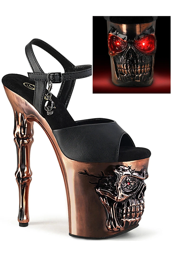 8″ (200mm) Finger Bone Heel, 4″ (100mm) Skull Sculpted Platform Ankle Strap Sandal Featuring USB Chargeable Red LED Lights with Multiple Static / Changing Patterns in the Eyes of the Skull and Back of Heel and Mini Skull Charms.