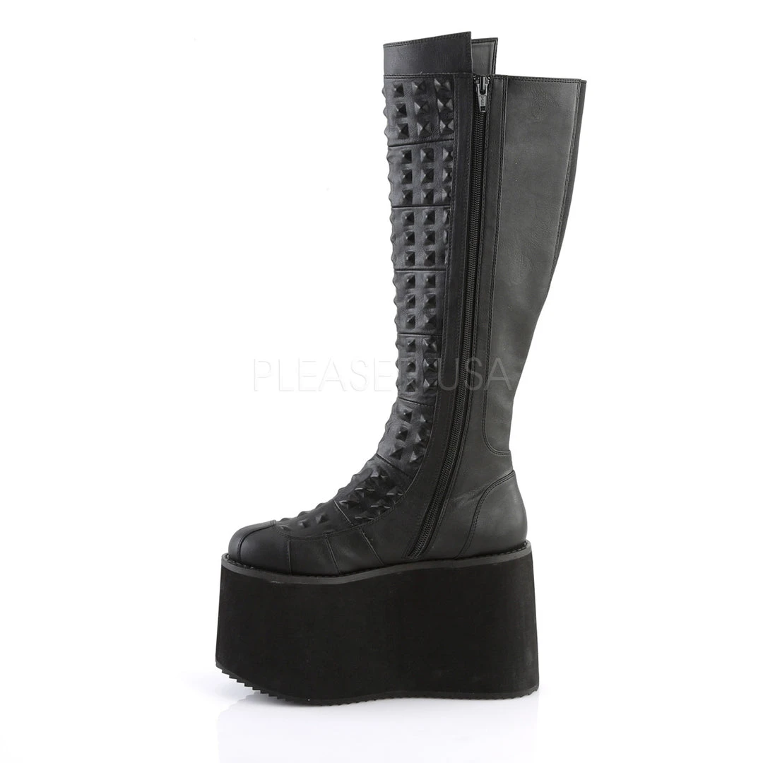 4 3/4″ (120mm) Platform Knee High Boot Featuring Embossed Pyramid Stud Front Panel and Back Elastic Panel, Inside Zip Closure.