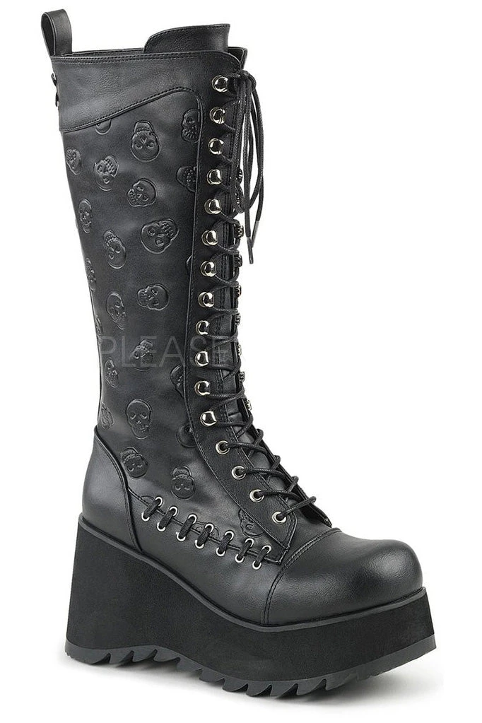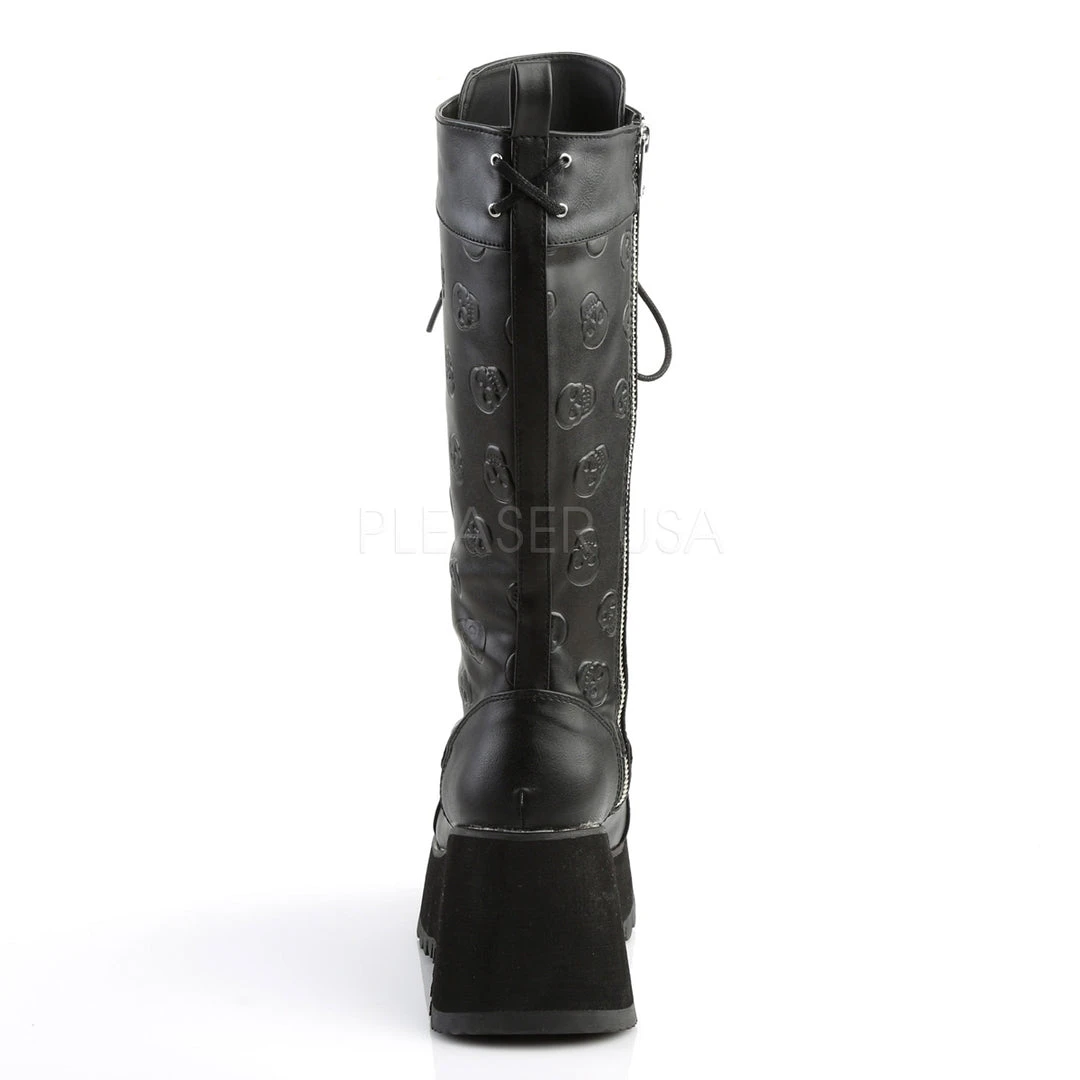 3 1/2″ (8.9cm) Platform Lace-Up Front Knee High Boot with Embossed Skulls on Shaft and Lacing Detail, Full Inside Zip Closure.