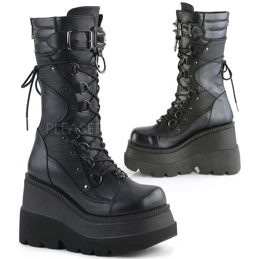 4 1/2″ Wedge Platform Lace-Up Mid-Calf Boot with Curvy Contrast Panel Designs on Vamp, Featuring Horseshoe Ring Ornament and Buckle Strap with Spike Studded Metal Plate and A Large O-Ring, Metal Back Zip Closure.