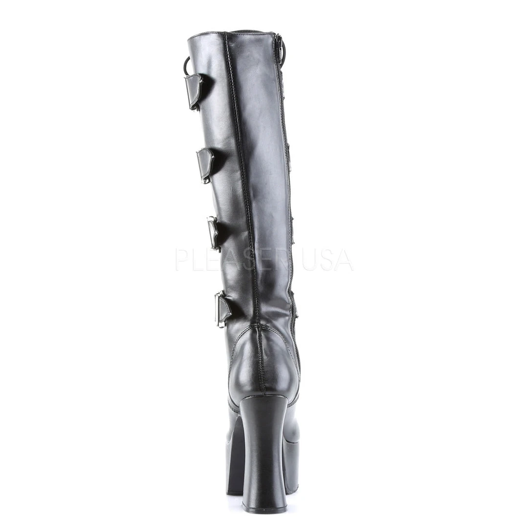 Black knee boots with five oversize side buckles, four and three quarter inch heel, two inch platform sole, laces and zip fastening. In Matte Black PU (vegetarian leather).