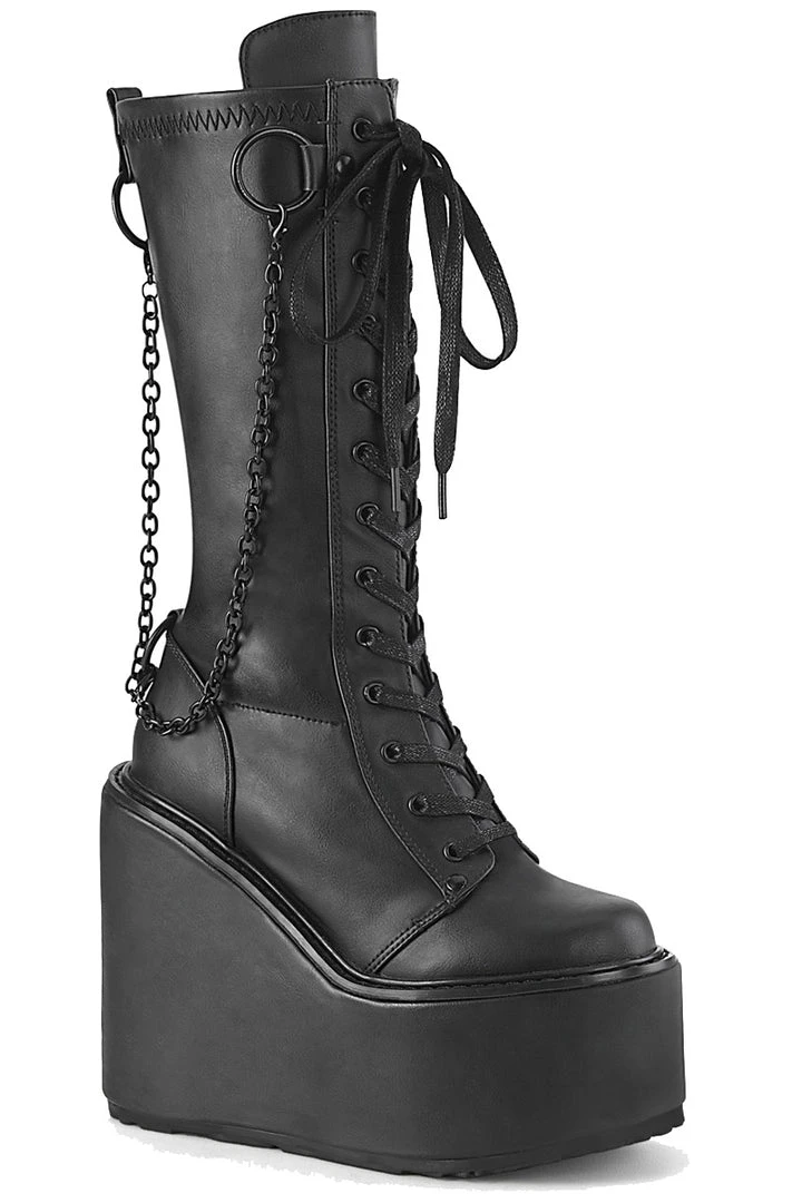 5 1/2″ (140mm) Wedge Platform Lace-Up Front Stretch Knee High Boot Featuring Removeable Metal Chain Detail, Inside Metal Zip Closure.