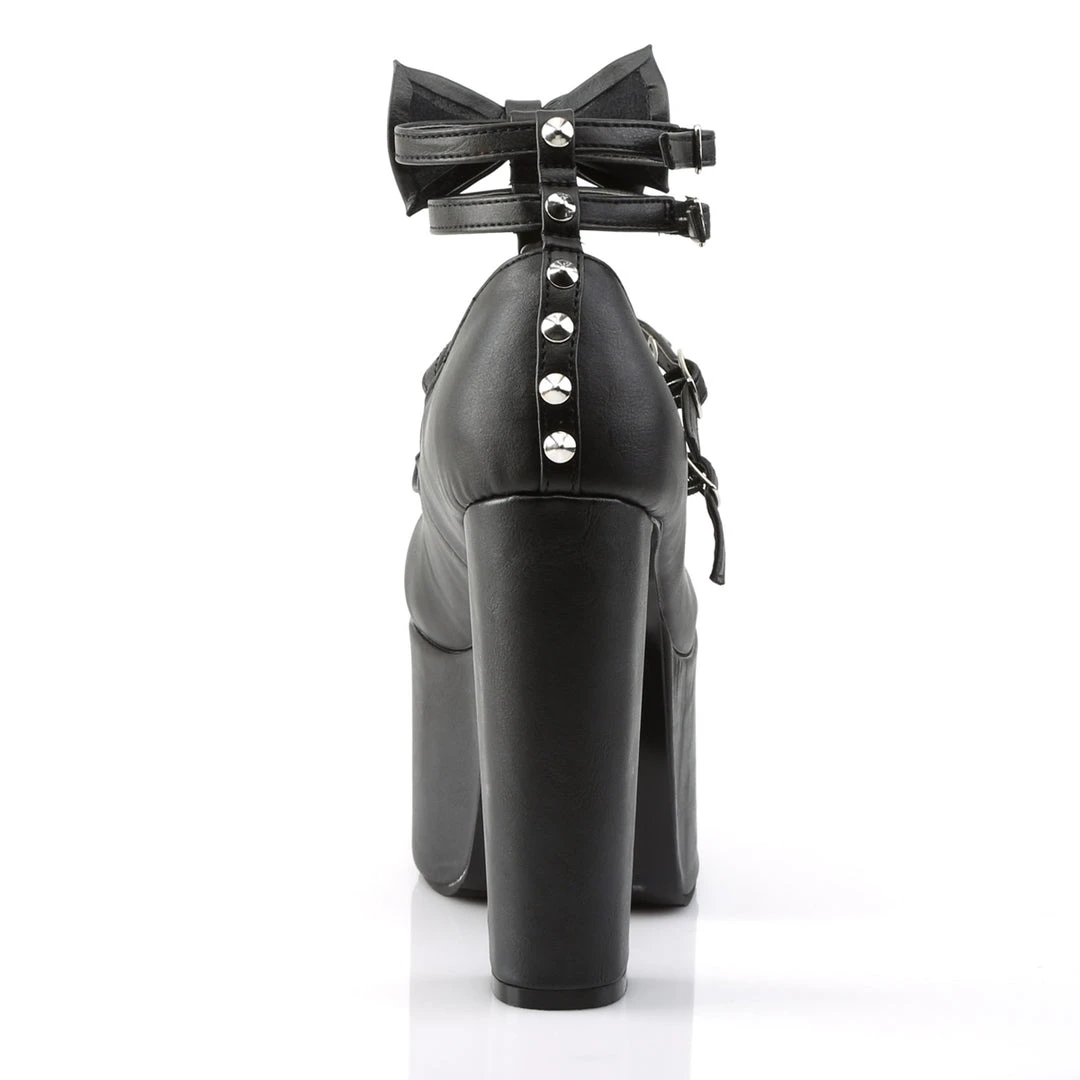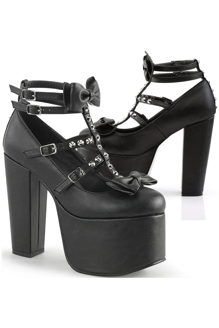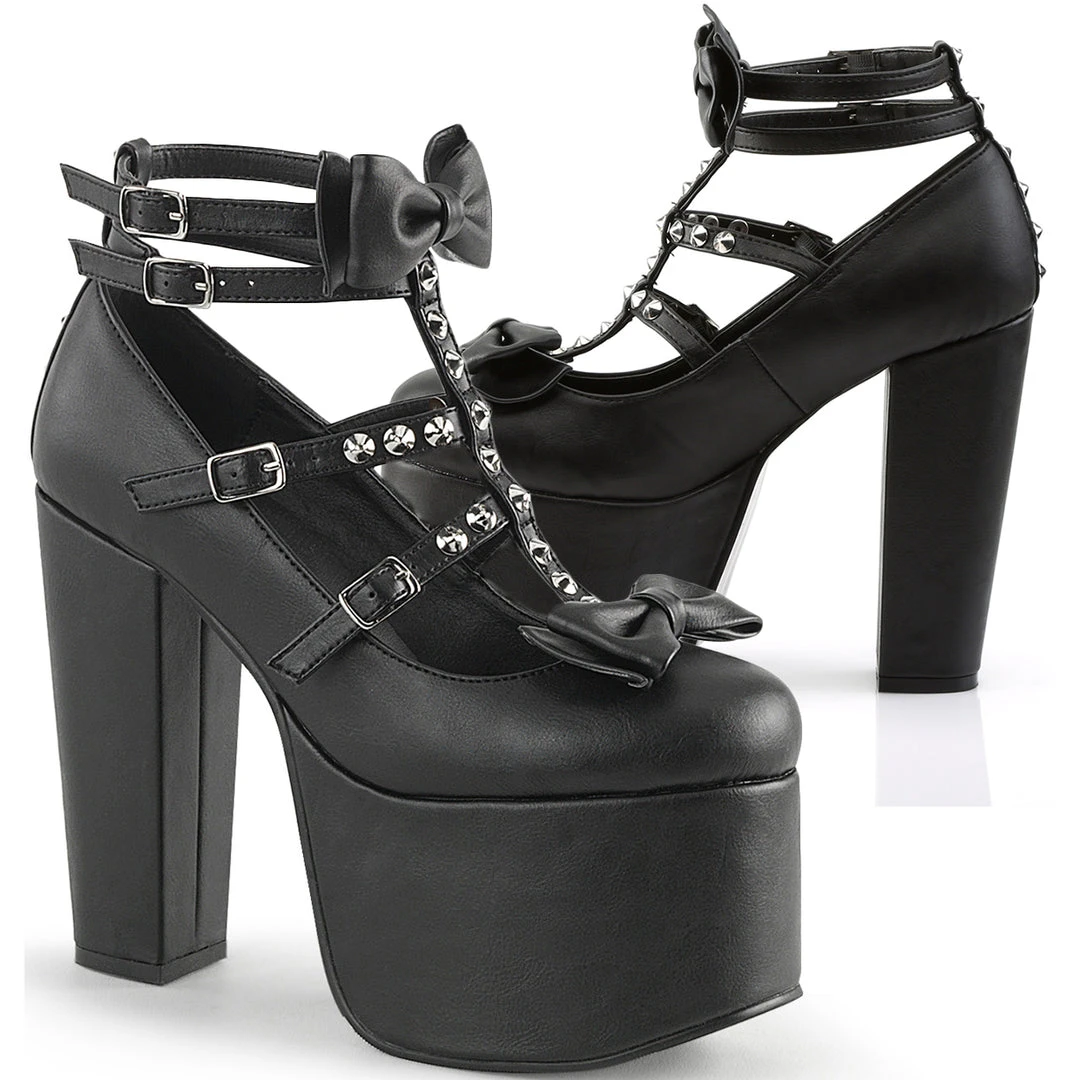 5 1/2″ (14cm) Block Heel, 3″ (7.6cm) Platform Strappy T-Strap Pump Featuring Double Bows and Spiky Studs Embellishment.