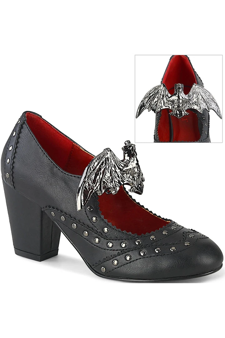 3″ (76mm) Cuban Heel Round Toe Wingtip Slip-On Maryjane Pump Featuring Elastic Strap with Large Metal Bat and Studding Detail.