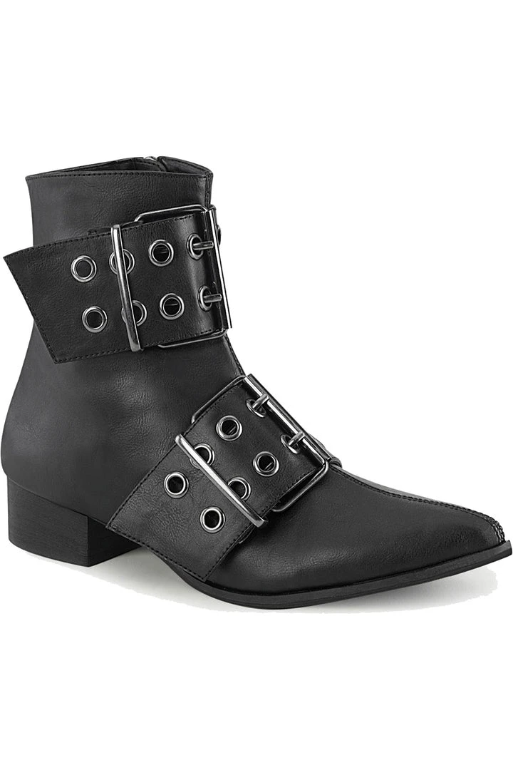 1 1/2″ (38mm) Block Heel Pointed Toe Winklepicker Style Ankle Boot Featuring Double Grommet Buckle Straps, Inside Zip Closure.