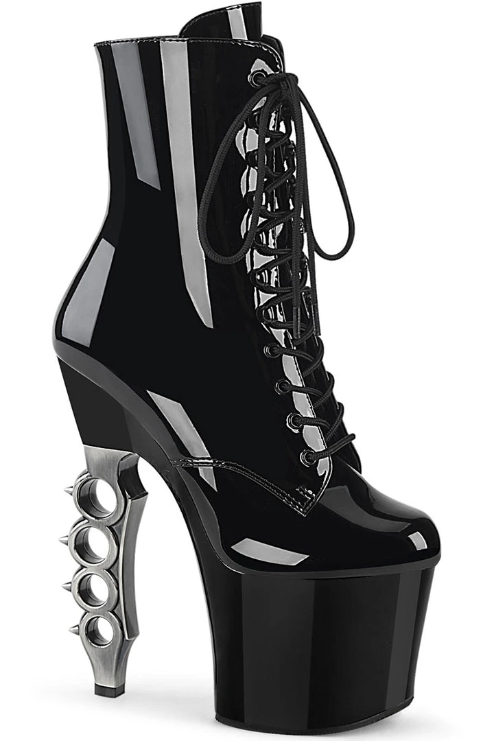 7″ (178mm) Heel, 3 1/4″ (83mm) Platform Lace-Up Front Ankle Boot Featuring Chrome Plated Brass Knuckles Heel, Inside Zip Closure.