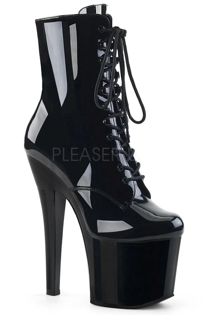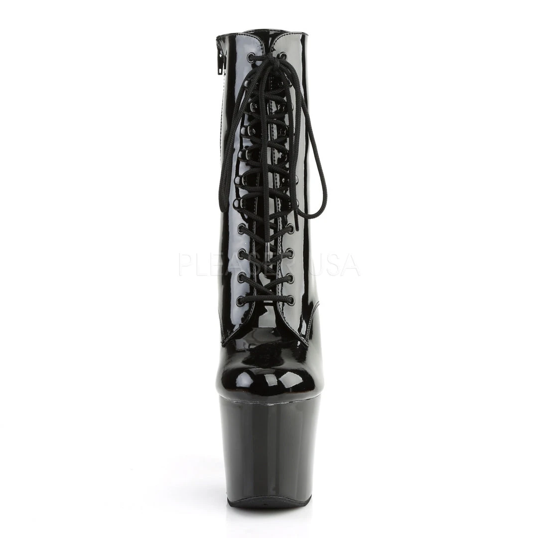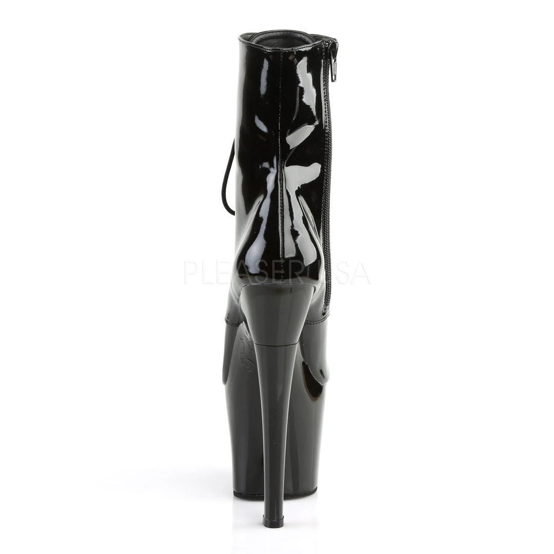 7″ (178mm) Heel, 3 1/4 (83mm) Platform Front Lace-Up Ankle Boot, Inside Zip Closure.