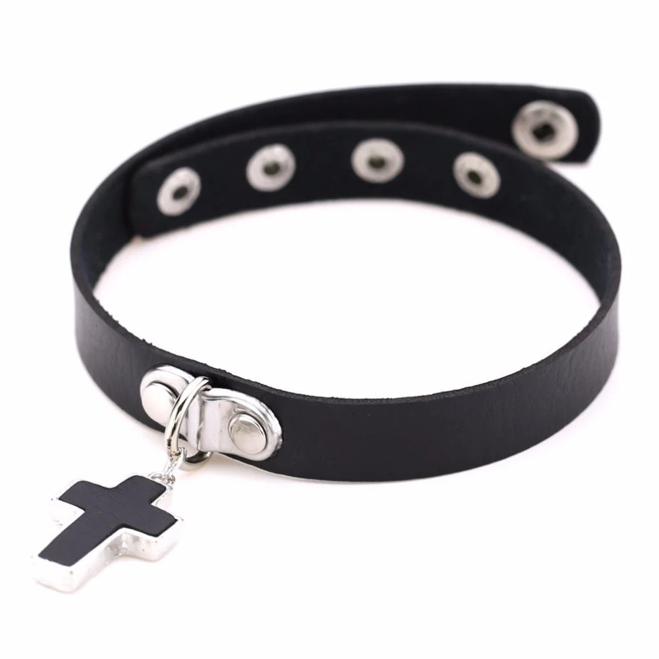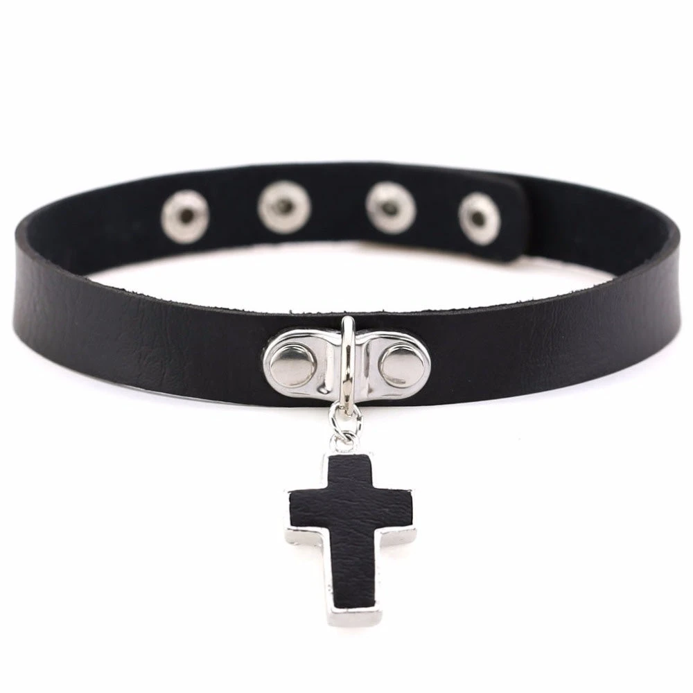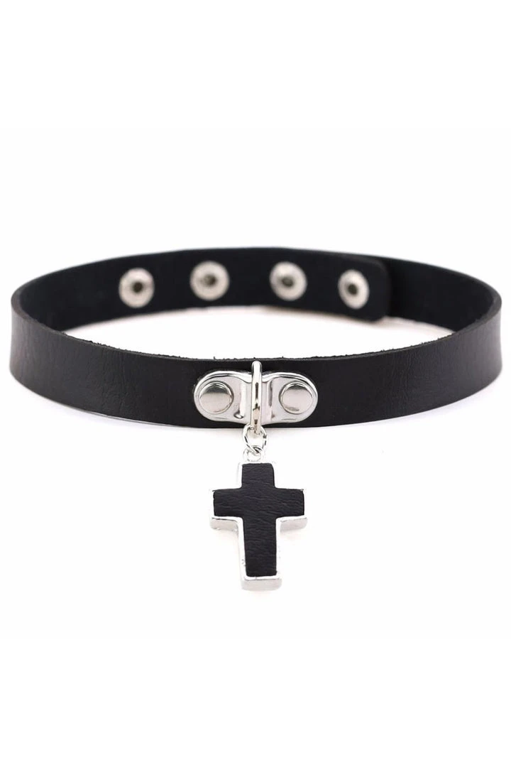 Black Faux Leather Gothic Collar with Central Cross Charm.