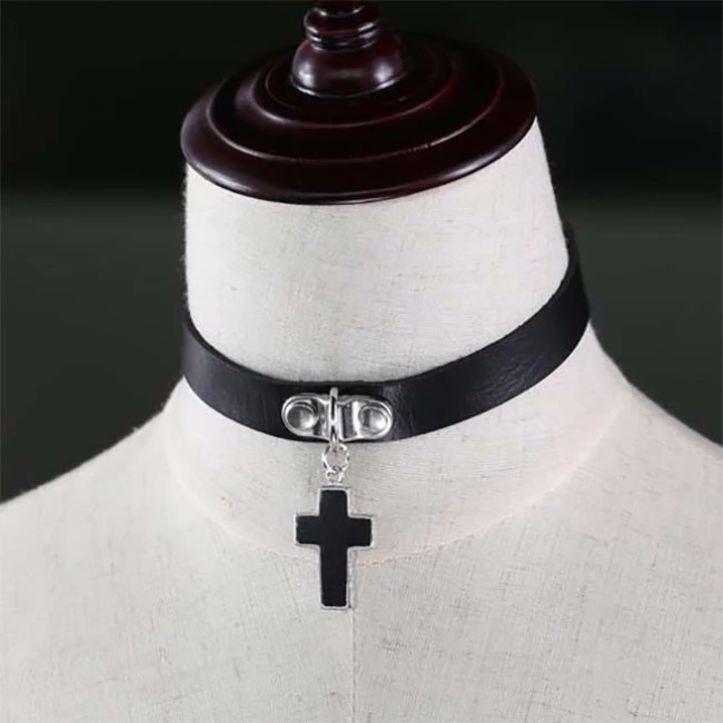 The choker features a silver tone Cross charm with black faux leather cross insert dangling from a central d-ring. The cross is approx. 3cm high and the band 18mm deep.