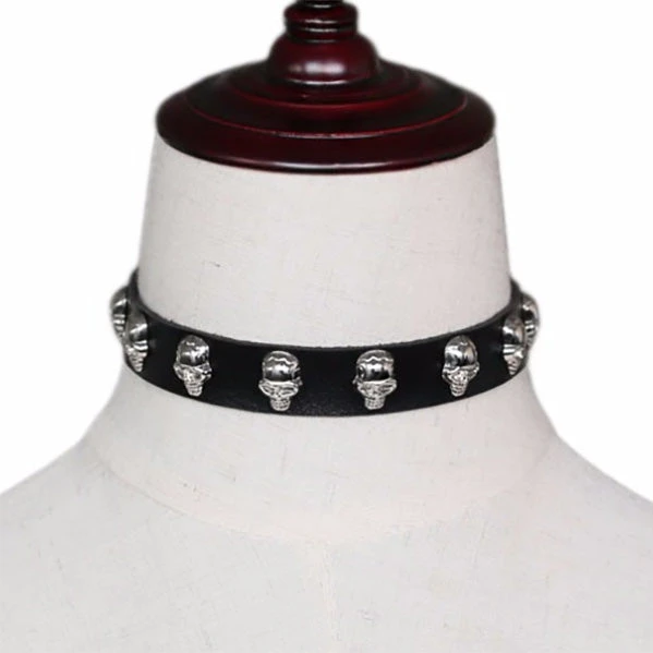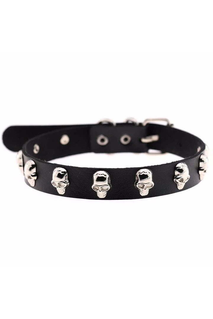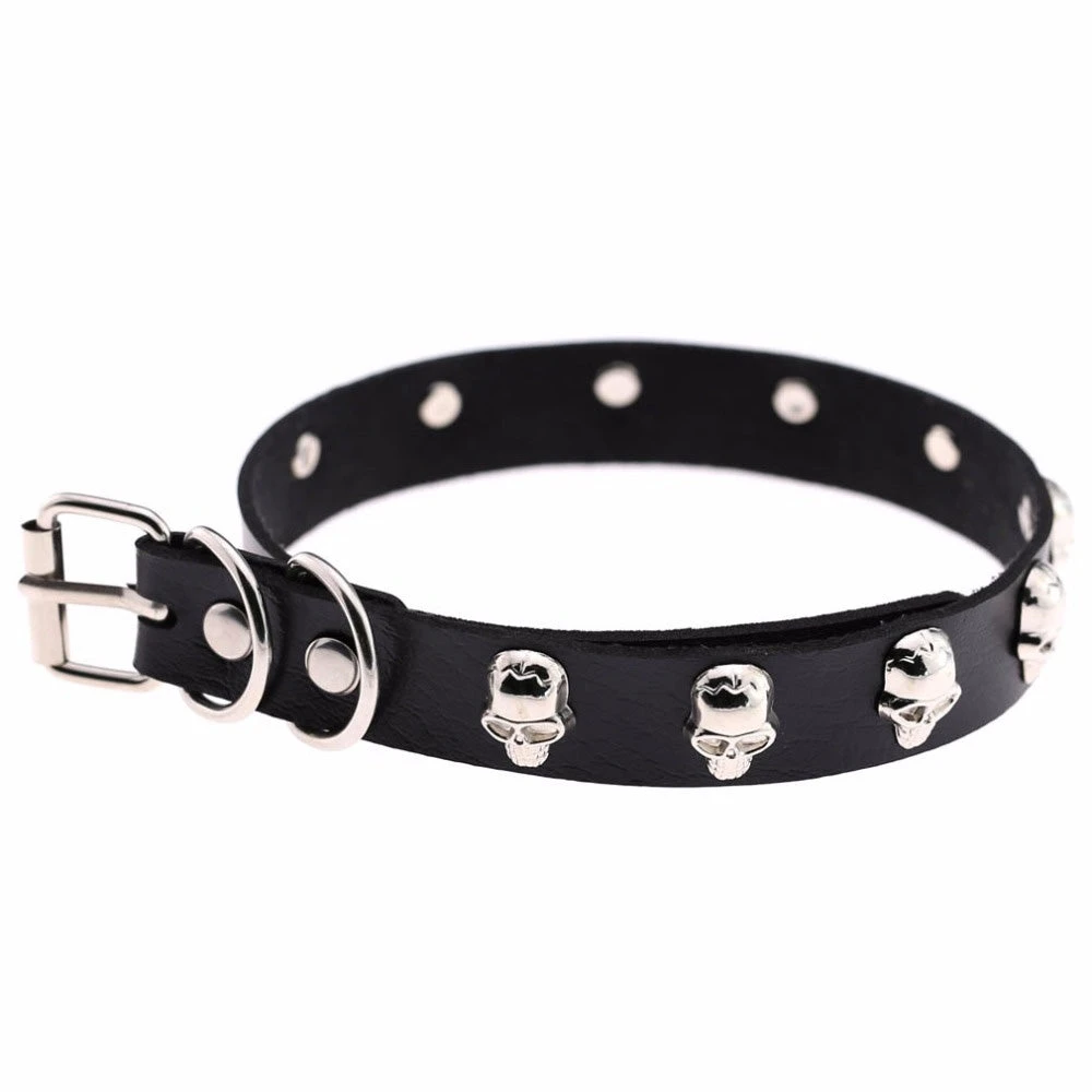 The collar features ten silver tone skull shaped studs along it’s length.
