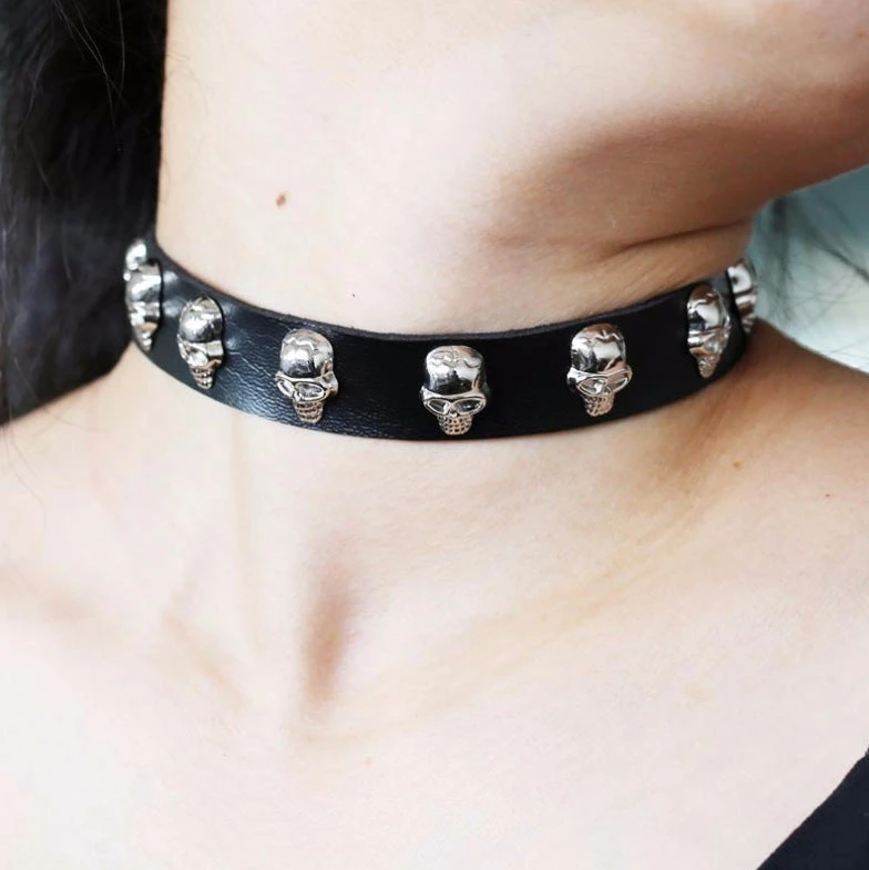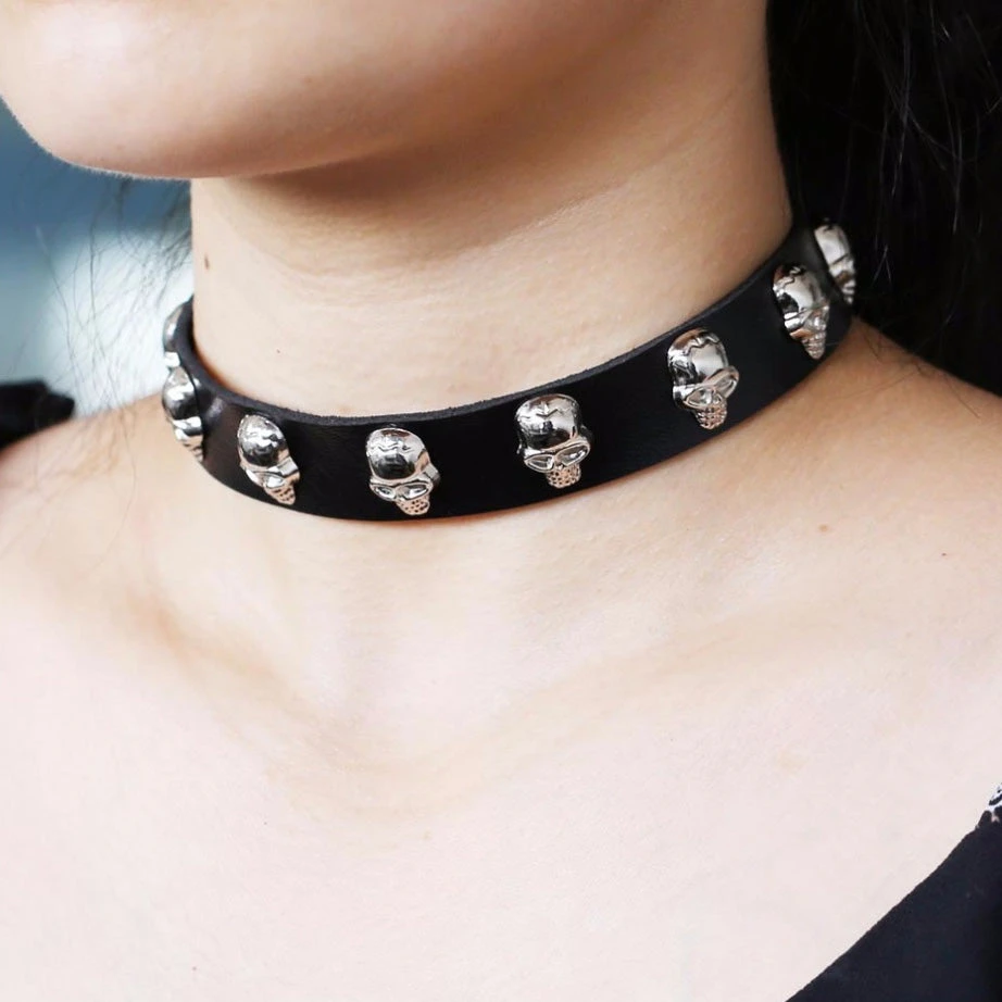 Black Faux Leather Gothic Collar with silver tone Skull Studs.