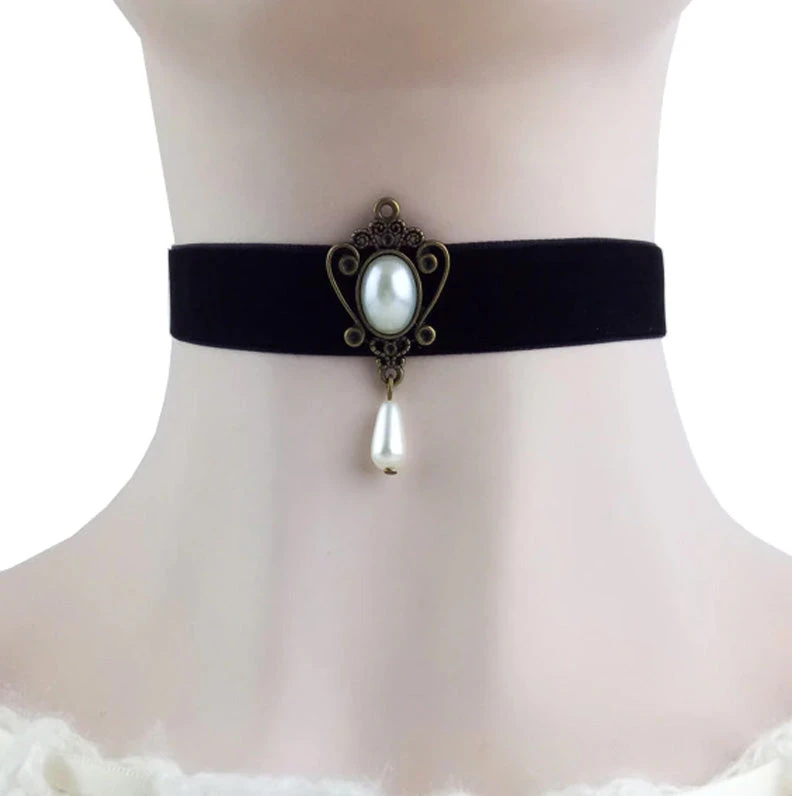 This beautiful gothic choker has a band of black velvet ribbon with central antique bronze tone filigree setting, oval pearl effect cabochon in the centre and a pearl effect teardrop bead dangling below.