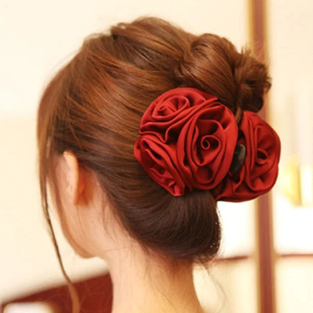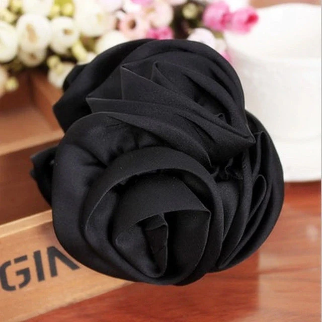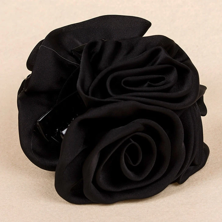 Three satin roses on each side arranged around a large black claw clip, approximately 9cm long. Perfect for creating a stunning up-do!
