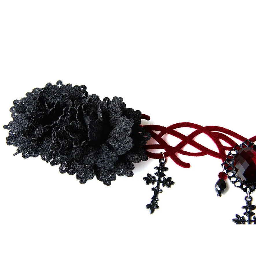 Gothic Headband. Attached with 2 hair clips – one on each side. 3 crosses dangle from the lower edge of a laser cut red tribal style cut out design with a central red jewelled cabochon with drops. The clip on either side are concealed with a cluster of black fabric flowers.