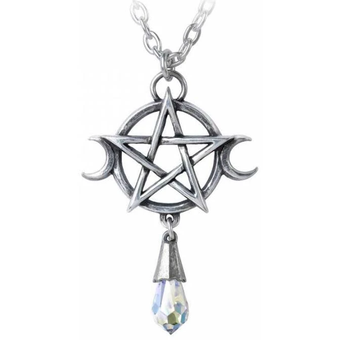 A pewter pendant of an interwoven pentagram set upon a ring, with a smaller crescent moon either side and suspending a clear Swarovski crystal dropper beneath.