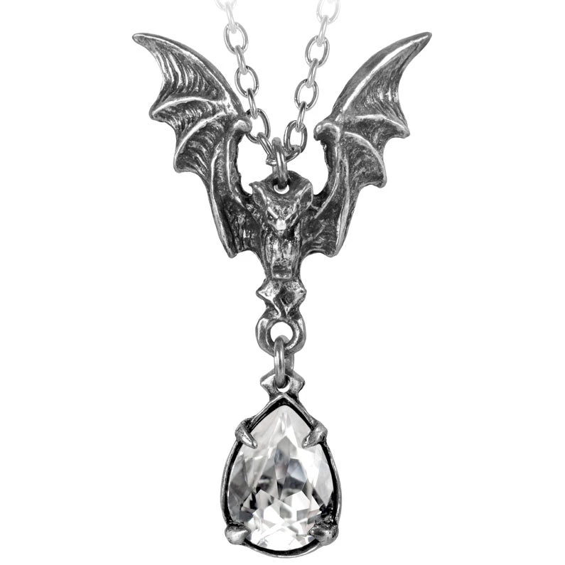 A crystal luxuriance on the wings of the night. A dainty, elegant necklace that’s sure to attract compliments. A pewter flying bat pendant with raised wings, suspending a clear crystal Swarovski teardrop in a pewter claw setting.