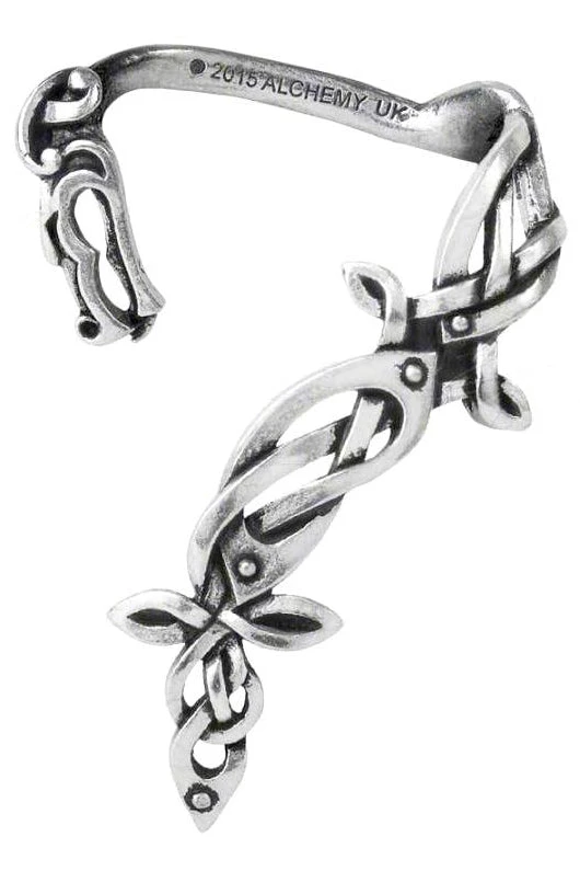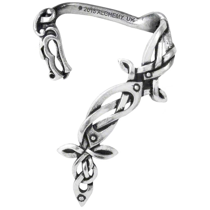 A polished pewter Celtic style knotwork dragon wrapping around the ear, the head appearing from behind the top of the ear. Can be gently bent to comfortably fit your own ear; fastened with one surgical steel ear-post.