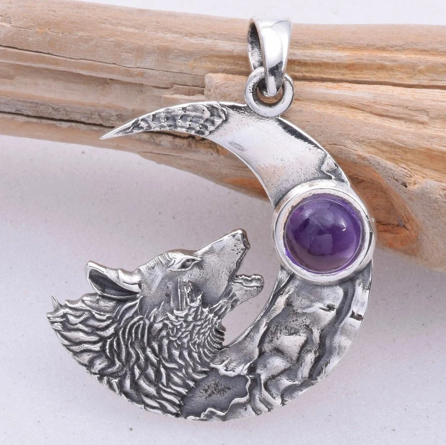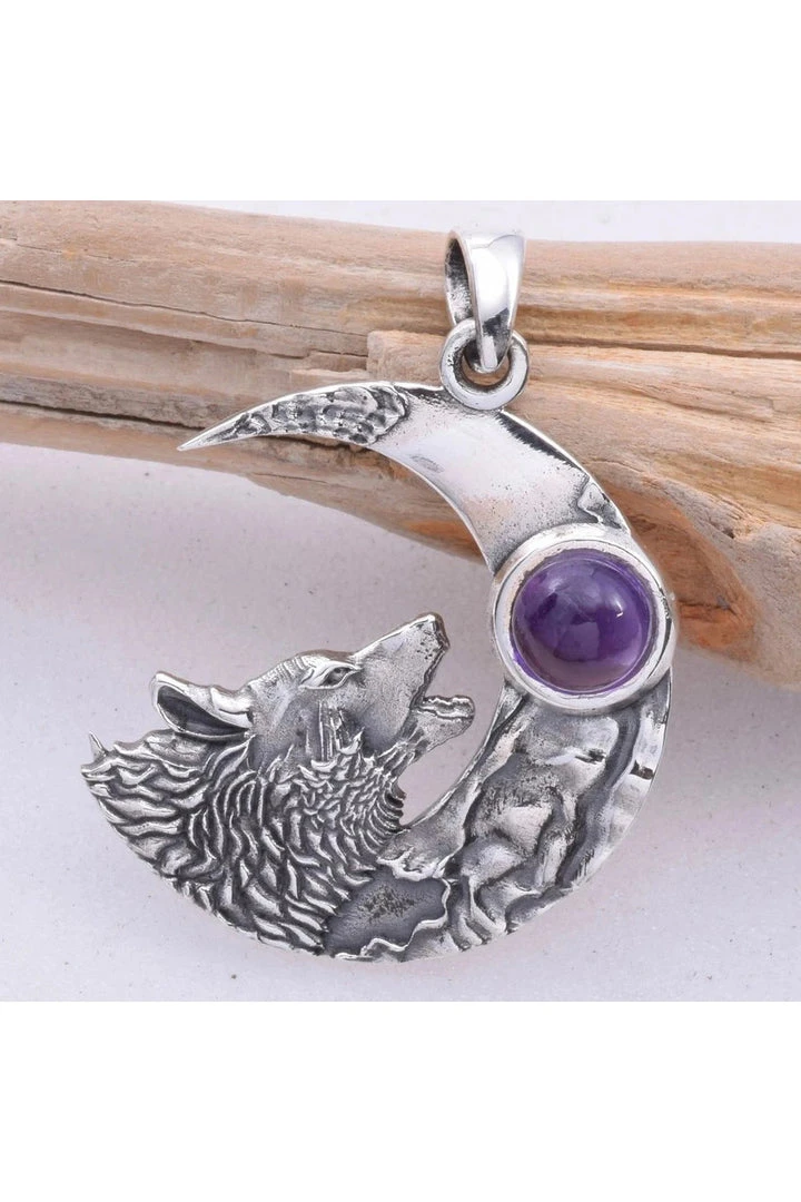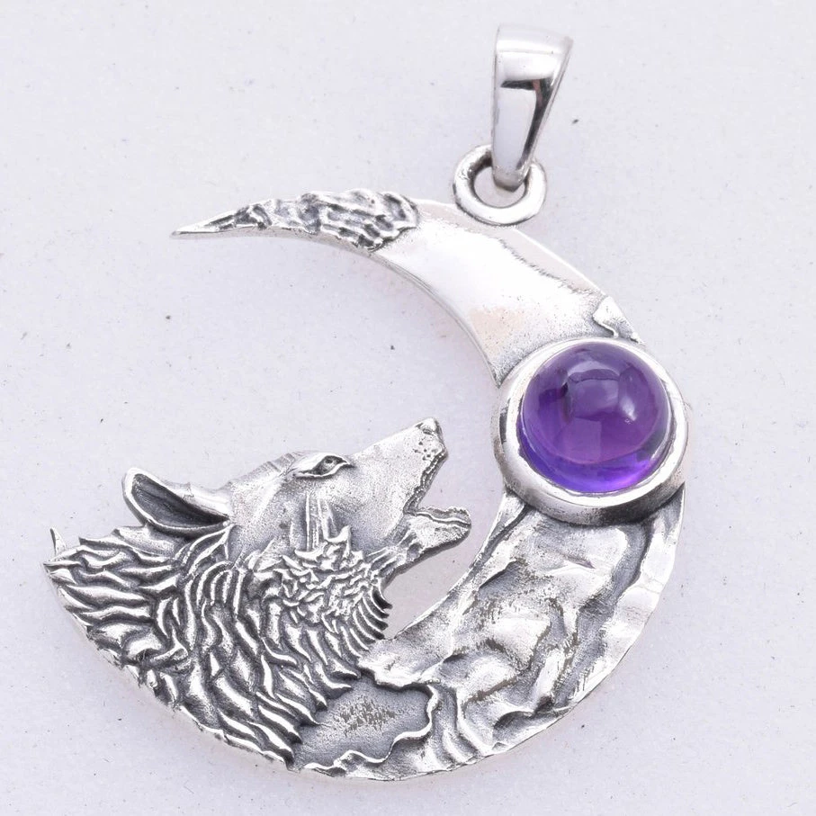 925 Silver Crescent Moon with Howling Wolf and Amethyst Pendant.