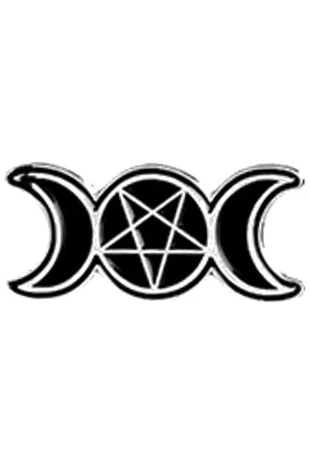 Triple Moon gothic pin brooch featuring two crescent moons and a central full moon with pentagram, measures approx. 2.6cm x 1.2cm and fastens with lapel pin style metal clutch back.