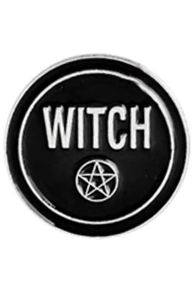 Witch and pentagram round gothic pin brooch measures approx. 2.5cm x 2.5cm and fastens with lapel pin style metal clutch back.