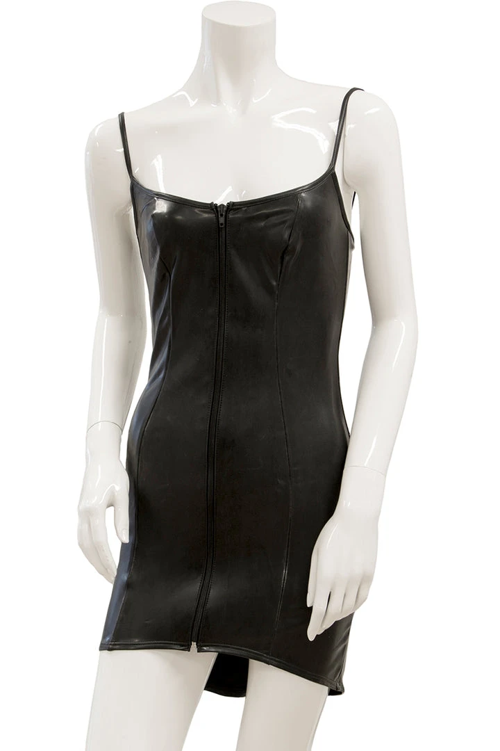 This black Datex mini dress is longer at the back, shorter at the front, has elastic adjustable spaghetti straps and extra seams for a tight fitting around the body. It has a walking slit at the back, and closes with a zipper at the front, that opens from the top down. A great eye catcher from the Guilty Pleasure Datex collection.
