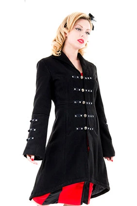 Ladies Reincarnation Black Coat from Hearts and Roses London. Military Style in a Soft Fabric, Coat is Fully Lined.