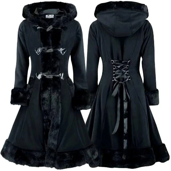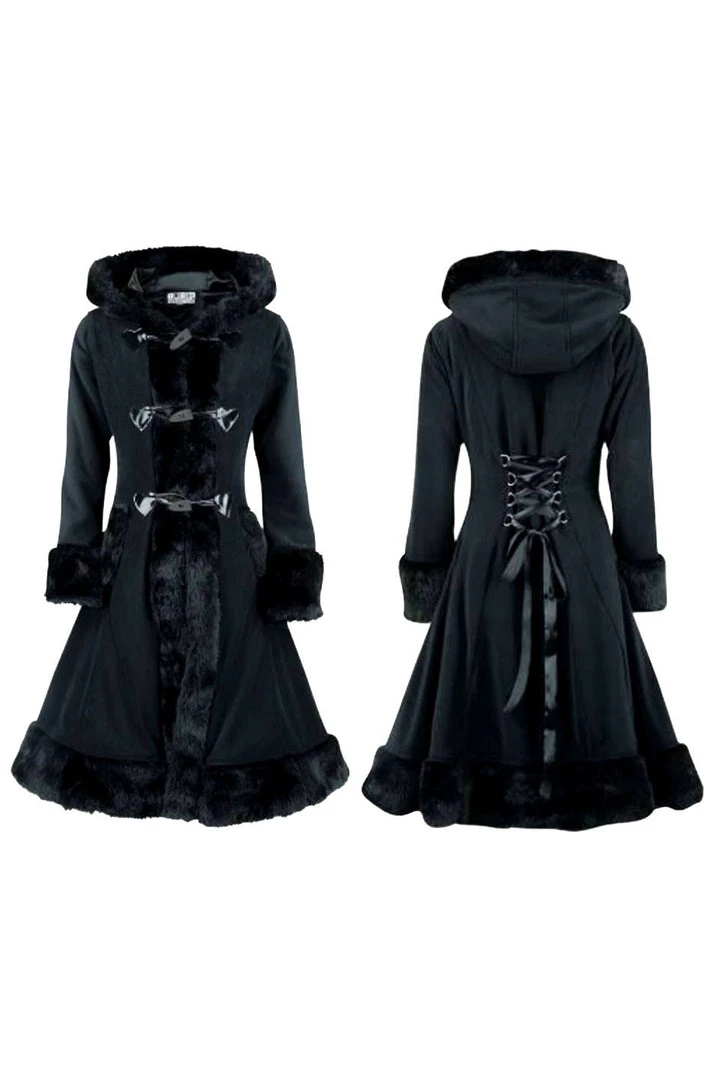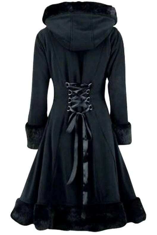 This 3/4 length Black fleece coat has black faux fur trim around the bottom, hood, pockets, sleeve cuffs and down each side of the front opening. It fastens with three toggle buttons accented with black PVC hearts on the fasteners at each side. There is a pocket at each side. The back of the coat has black corset style ribbon lacing through d-rings at the waist. The coat has a black satin type lining.