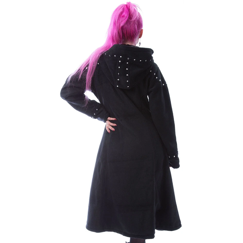 Made from black polar fleece type fabric with a black satin style lining it’s sure to keep you cosy, while the silver tone stud detailing on the cuffs, hood, shoulders and pocket trim give it that alternative edge.