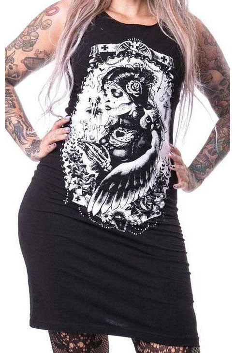 This black stretch cotton spandex mini-dress features a spooky print of a skeletal goth lady with day of the dead style make-up holding an hour glass topped with a raven skull with an owl spreading it’s wings behind her like an angel. The upper back of the dress has horizontal slashes with a black lace under-layer.