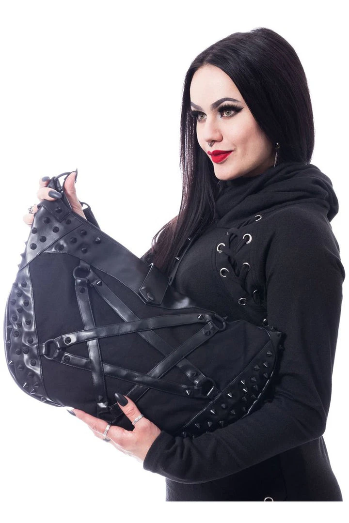 This awesome Gothic shoulder bag in black cotton with black faux leather trim features black spike studs and an inverted pentagram in strapping detail through black o-rings on the front.