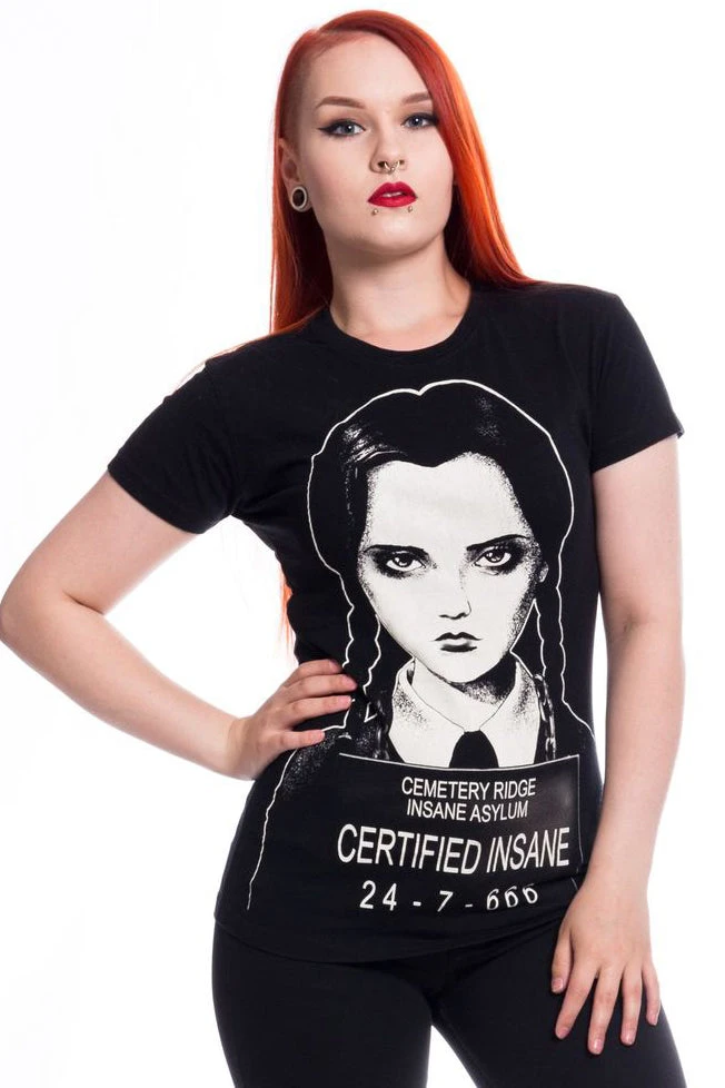 Black Heartless T-Shirt with a image of Wednesday with text related to Certified Insane.