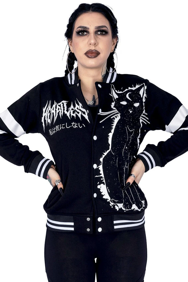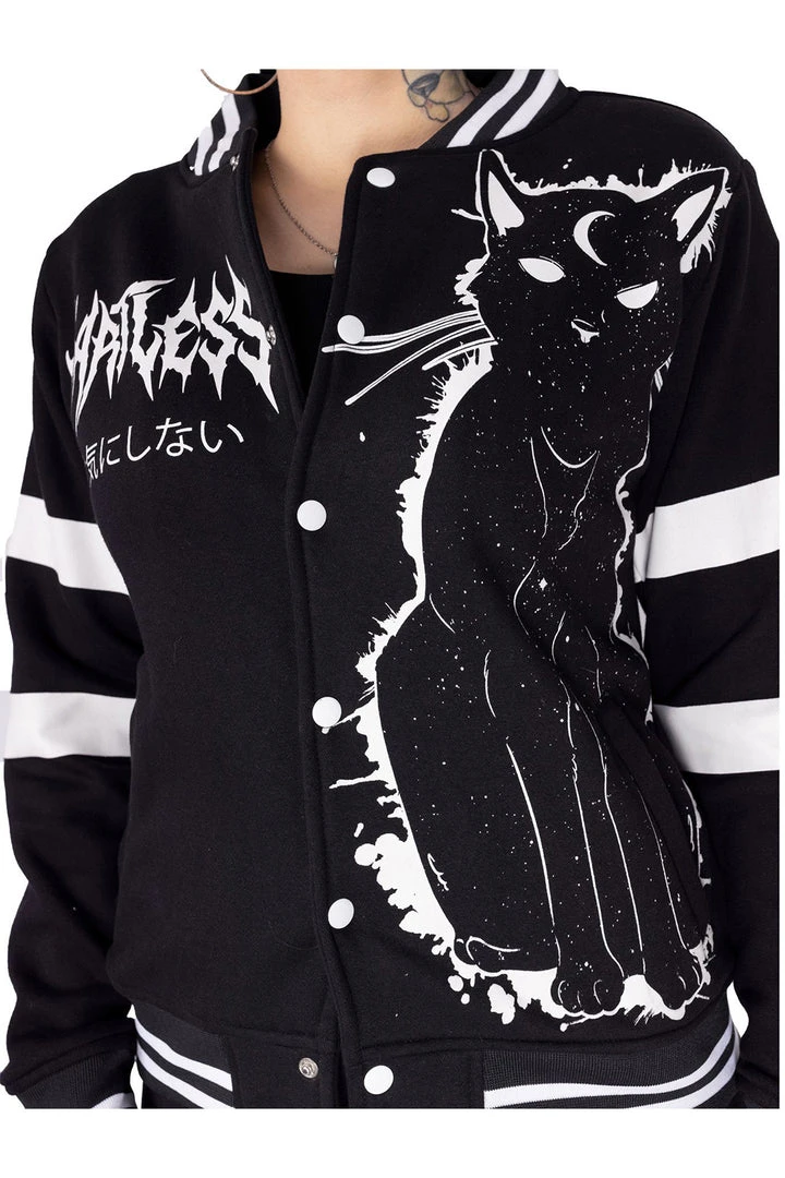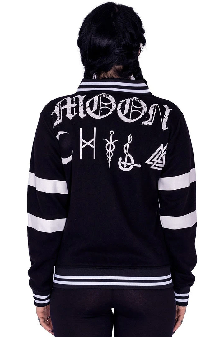 Black and white Varcity style sweatshirt jacket with Moon Kitty print design in white. Jacket fastens with press studs at the front. A pocket to each side and Moon text and symbols print on the back.