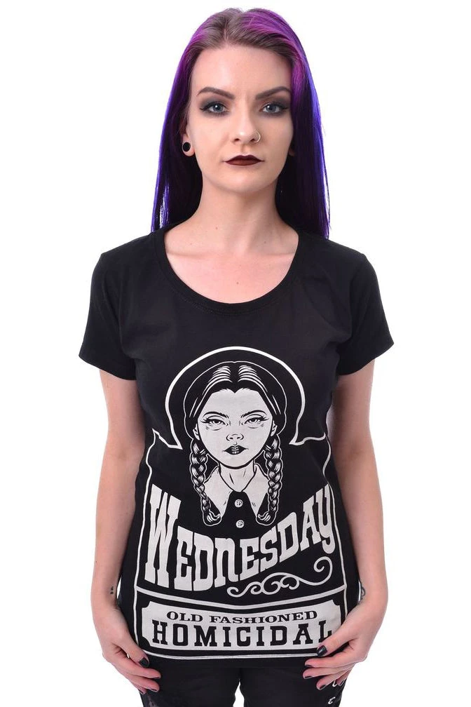 This super cool ladies fitted t-shirt features a white print of Wednesday Adams on the front with the stylized text “Wednesday” and underneath “Old Fashioned Homicidal”. The back of the top features the Heartless logo with heart shaped ribcage and logo text.