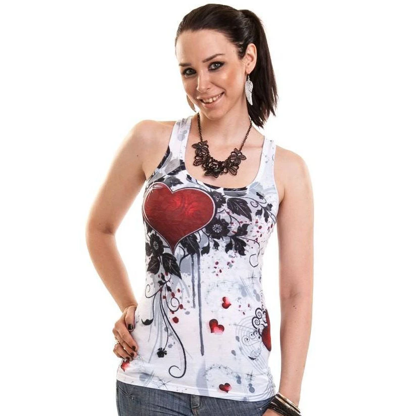 From the makers of Poizen Industries, this fitted sleeveless gothic vest top features a floral lace back panel and is adorned with red hearts and black swirls which entwine, almost in a tattoo style design. The design is also printed on the back of the vest in the lace.