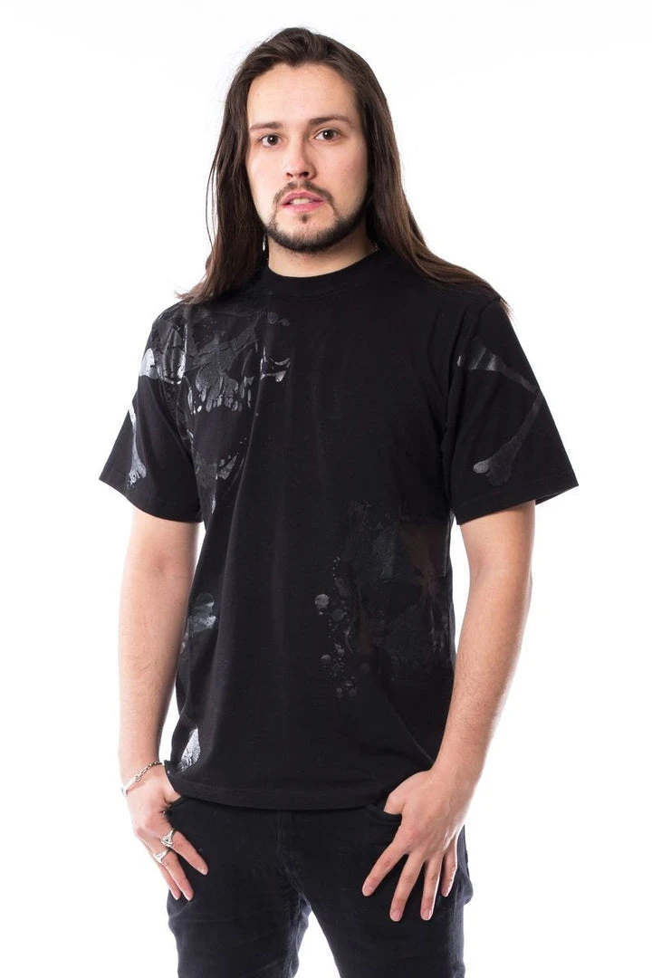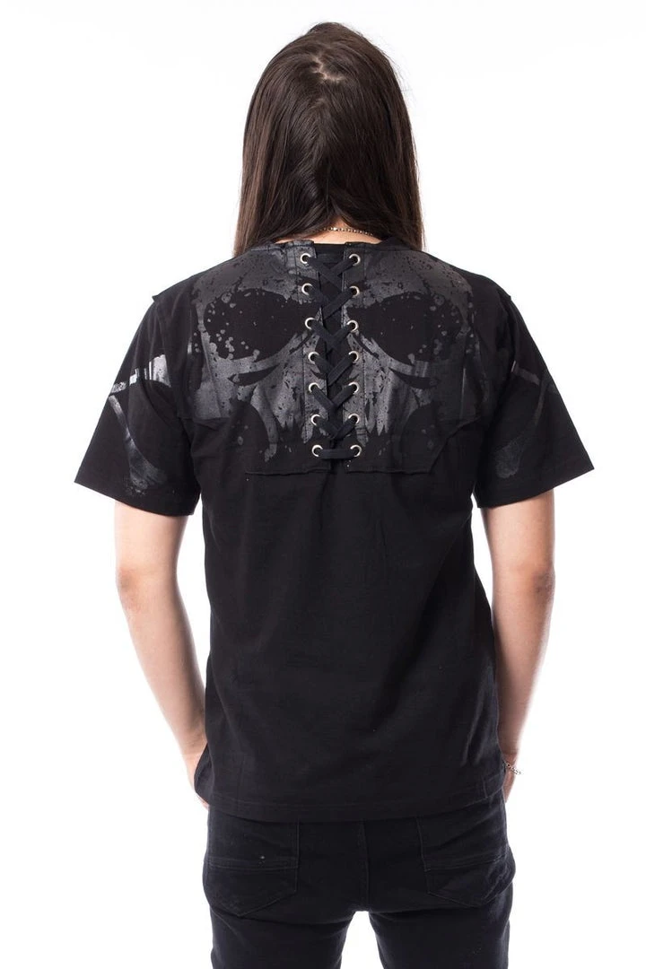 This great alternative mens gothic T-shirt black cotton features a black print of skulls and skull and crossbones motifs. The back has more prints and corset style lacing through eyelets on the upper back. Great for gothic summerwear!