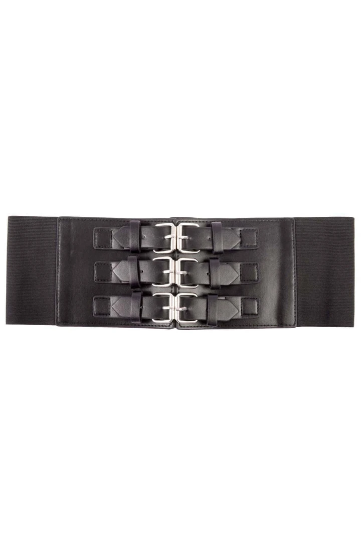This great corset style waist belt has three faux leather straps across the front each with a double adjustable silver tone buckle. The sides and back of the belt are of wide elastic with a press stud fastening at the back.