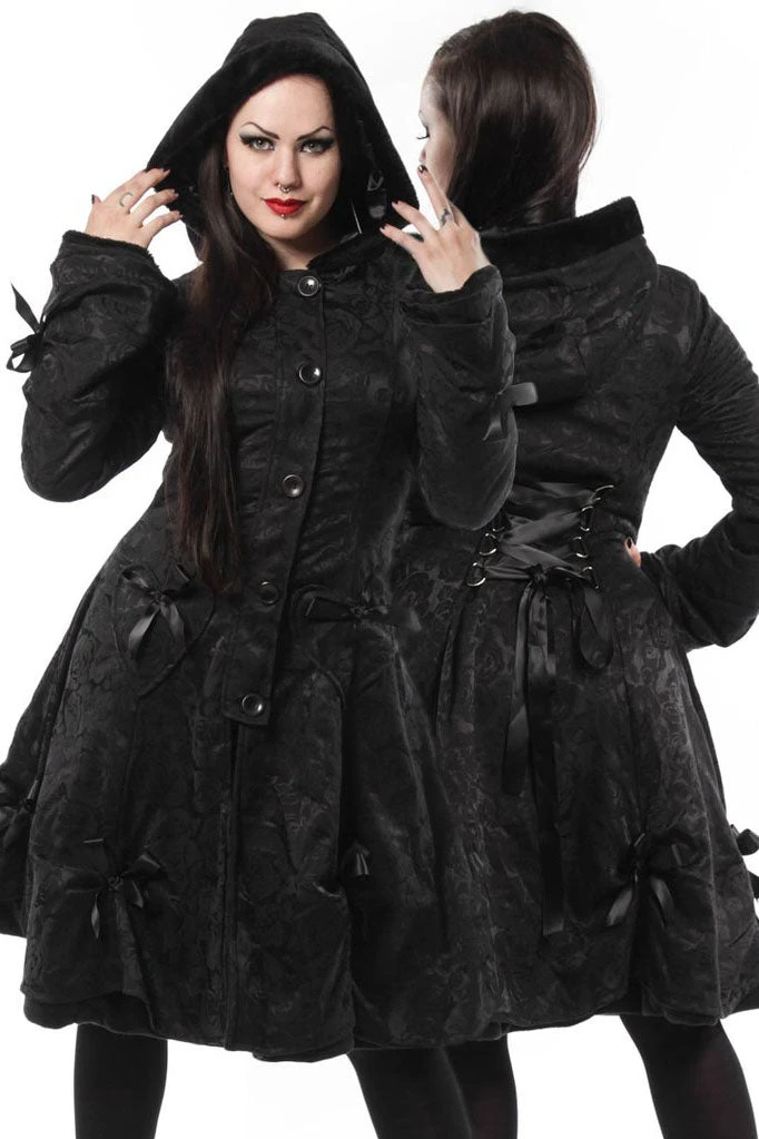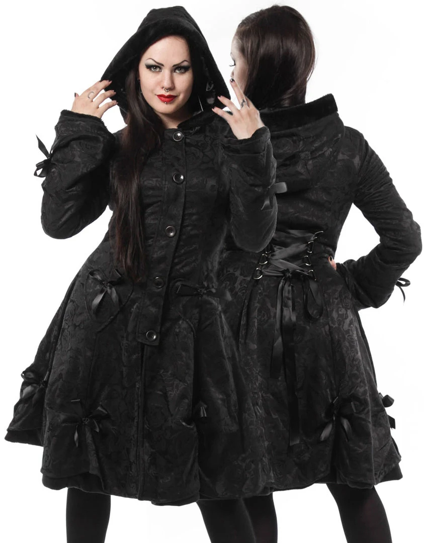 This 3/4 length Black coat in a Rose patterned brocade style fabric has black faux fur trim around the hood and inside the double layered sleeve cuffs. There are black ribbon bow accents on the sleeves, on the heart shaped patch pockets and at gathered points around the bottom of the coat. The coat fastens with a concealed zip behind a row of black buttons up the front. The back of the coat has black corset style ribbon lacing through d-rings at the waist. The coat has a black fleece lining.