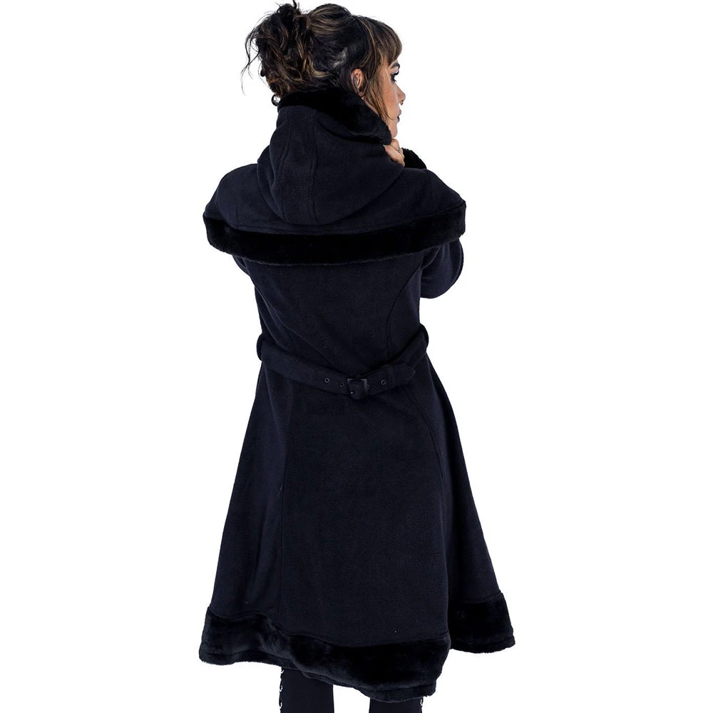 Black fleece 3/4 length coat with faux fur trim to the hood, sleeve cuffs, pocket edges and detatchable shoulder cape. Coat fastens at the front with buttons.