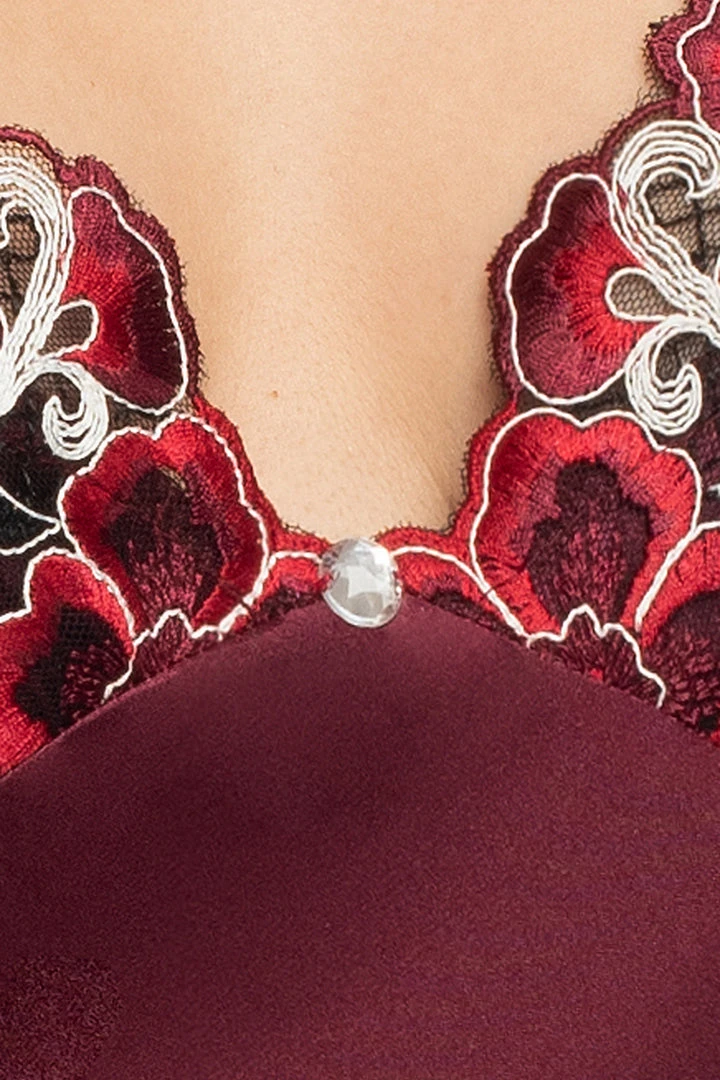 Stunning nightdress made with luxurious satin and pretty delicately embroidered lace. This design features adjustable shoulder straps and a beautiful jewel in the centre of the cups.