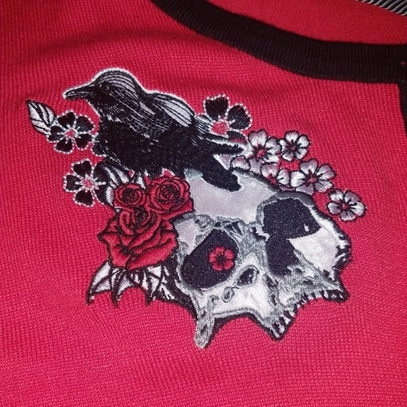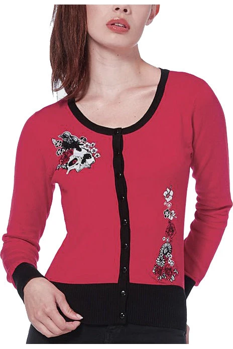 This lovely gothic cardigan has an embroidered Raven perched on a skull, surrounded by red roses and other flowers on the chest, with more roses and flowers lower down on the opposite side of the cardigan. While the main body of the cardigan is an eye-catching red, the neck hem and cuffs are trimmed in black and it fastens with black buttons down the front. A lovely addition to your gothic wardrobe.