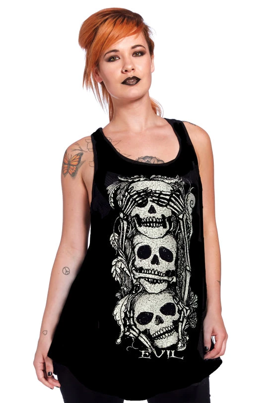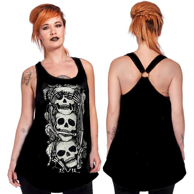 Ladies long line sleeveless gothic vest top in a soft rayon spandex fabric, with an o-ring racer style back. This cool top has crackle effect print featuring three skulls – See No Evil, Speak No Evil, Hear No Evil. The top has a slight flare and long cut, so should go well with leggings!