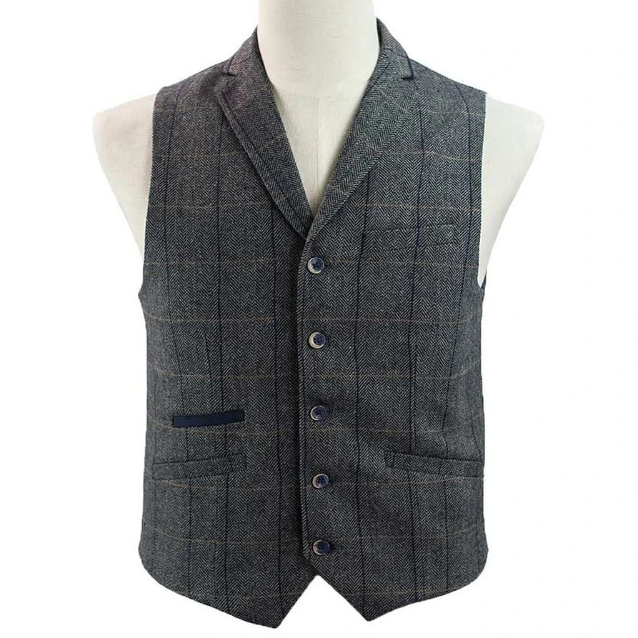This classically stylish mens checked waistcoat in a grey tweed style fabric with lapels and collar is fully lined and has a pocket at each side and a chest pocket for hankie etc. The waistcoat has a navy blue back panel with buckle adjuster strap. The front fastens with buttons. An ideal finishing touch to any Steampunk Gentleman’s outfit!