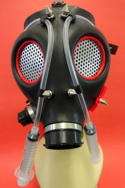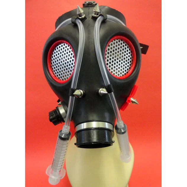 Medical Themed Black Cyber Gas Mask with Syringes, UV Clear and Red Tubing and Spikes.