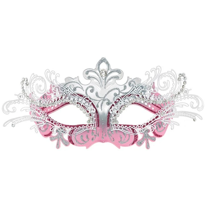 Venetian Style Luxury Masquerade Mask laser cut from metal with a pink and silver finish.
