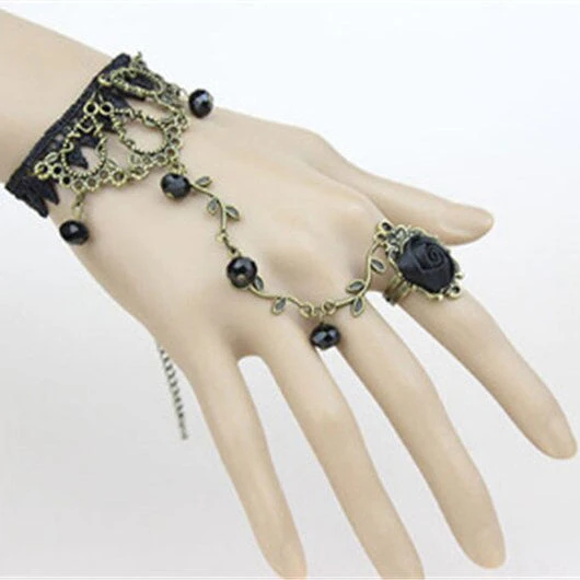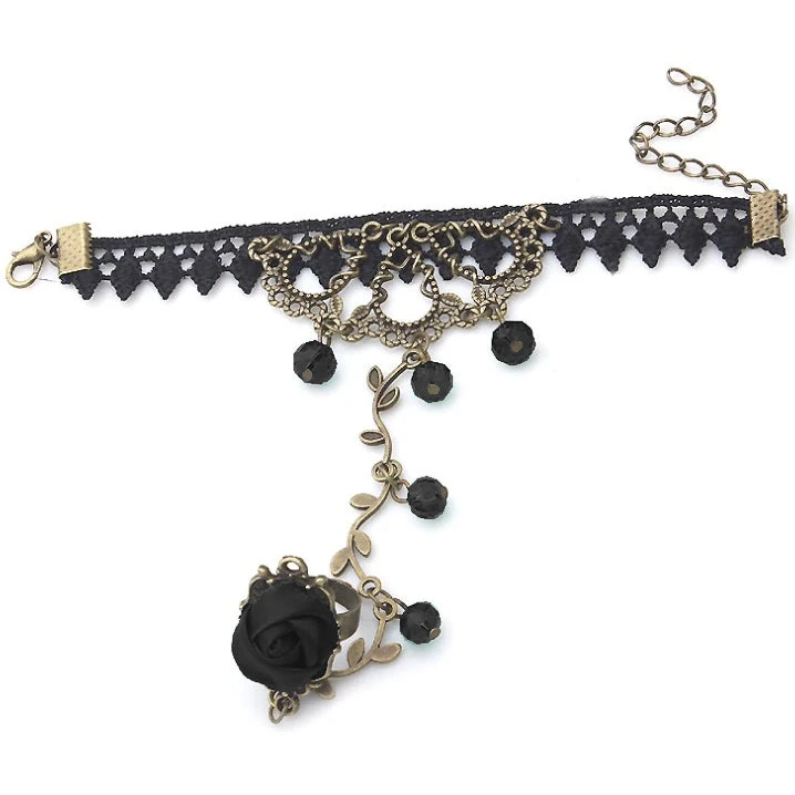 Beautiful Black Lace Gothic Bracelet featuring antique bronze teardrop loop connectors with black faceted beads. The bracelet has bronze tone leaf connectors leading to to a matching ring with black satin ribbon rose. Both the bracelet and ring are adjustable. Bracelet fastens with a lobster clasp at the wrist.