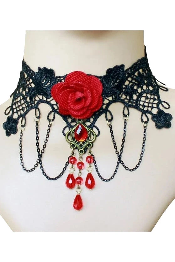 Beautiful Black Lace Gothic Choker featuring a central red fabric rose, with antique bronze tone filigree chandelier and cascade of red teardrop beads below and red acrylic faceted gem in the centre. Black chains drape on either side. Necklace fastens with a lobster clasp at the back of the neck.